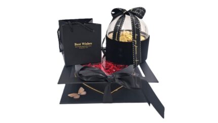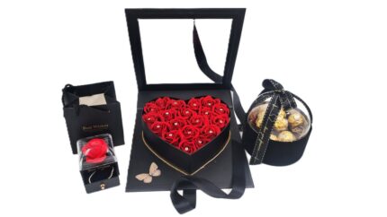 Το απόλυτο δώρο για εκφραση αγάπης και έρωτα. Μαύρη καρδιά κασετίνα με διαφάνεια γεμάτη αρρωματικά κόκκινα soap roses με ''διαμαντάκια'' στην καρδιά τους, ένα βραχιολάκ ιstainless με stras σε κουτάκι με συρταράκι και διακοσμητικό τριανταφυλλο και ένας θόλος μαύρος βελουτέ με σοκολατάκια.