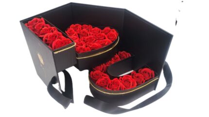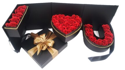 Το απόλυτο δώρο για εκφραση αγάπης και έρωτα. Μαύρη καρδιά κασετίνα με διαφάνεια γεμάτη αρρωματικά κόκκινα soap roses με ''διαμαντάκια'' στην καρδιά τους, ένα βραχιολάκ ιstainless με stras σε κουτάκι με συρταράκι και διακοσμητικό τριανταφυλλο και ένας θόλος μαύρος βελουτέ με σοκολατάκια.
