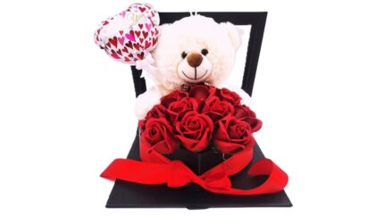 Μέσα σε μια μαύρη κασετίνα καρδιά καθεται ένα γλυκό αφράτο λούτρινο μπεζ αρκουδάκι και κρατάει ένα μπουκέτο από κόκκινα αρωματικά soap roses και ένα μπαλονάκι καρδιά.