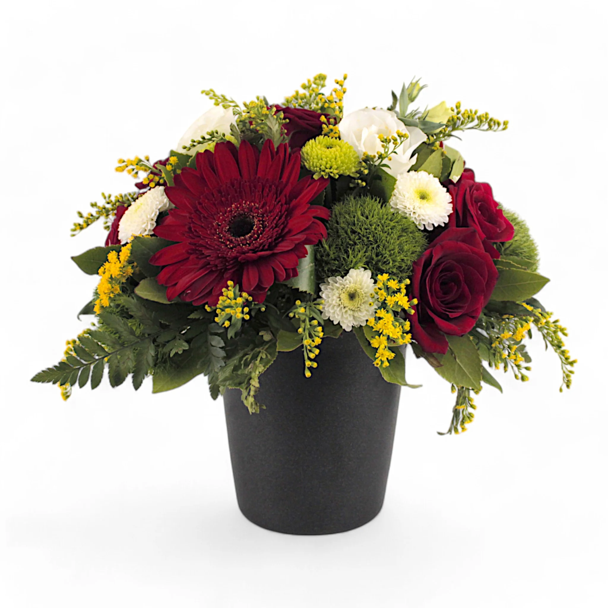 Σύνθεση λουλουδιών σε μαύρο σκεύος.